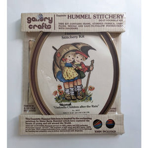 The Vintage Hummel Stitchery Kit "Children After the Rain" offers a delightful and nostalgic crewel embroidery experience that brings to life a heartwarming scene of joy and innocence. This kit, featuring the artwork of Hummel, captures the essence of childhood wonder as two children joyfully embrace the beauty of nature after a refreshing rain shower.