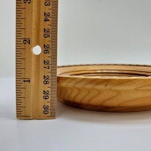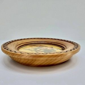 Mini decorative wood plate with Hummel image of a boy hiking & carrying flowers. Picture is protected by a piece of clear plastic. Border has a wood burned scalloped design & has a lightly lacquered finish. Hang on the wall using the hole in the back or set on a small display easel.