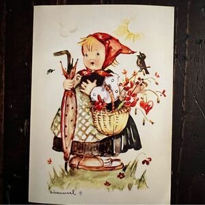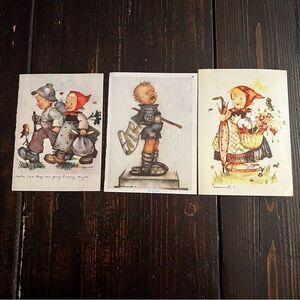 Set of three charming vintage Hummel art prints. Features playful children in various scenes. Perfect for collectors and art enthusiasts. These items have been written on the back. Each are 5 1/2” x 4”. I believe these cards are from the 1950’s.