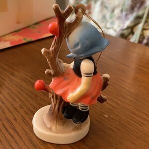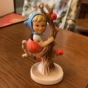 Vintage Hummel “look” hard plastic girl sitting in a tree with apples Christmas tree ornament