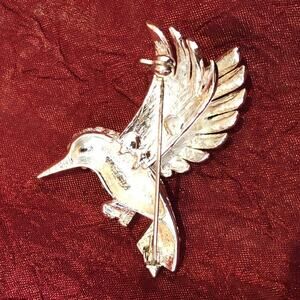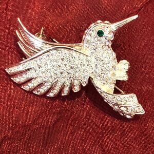 Vintage Hummingbird In Flight Brooch/Pin Rhinestones . Hummingbird with a green eye and rhinestones wings. Silver-tone 2.25x2”. Stunning Brooch Preowned