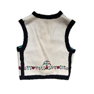Beautiful vintage handmade wool vest featuring vibrant hand-embroidered floral motifs inspired by traditional Eastern European folk art. Crafted from soft cream wool and lined in turquoise cotton, this piece shows artisan detail in every stitch from the textured black trim to the braided tassel tie front. A timeless layering gilet that bridges heritage craft and bohemian charm.