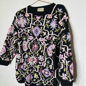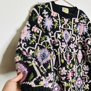 Vintage Hunters Run Hand Knit Black Pink Floral Pom Pom Detail Sweater Size L