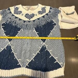 Vintage Huntington Ridge Blue & Cream Heart Hand Knitted Sweater Size M
