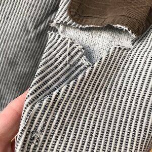 Vintage Hurley double button front elbow patch heavyweight distressed pinstripe hoodie size large. Gently used with a tear under one elbow patch - please see photos. 65% cotton, 35% polyester.