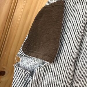 Vintage Hurley double button front elbow patch heavyweight distressed pinstripe hoodie size large. Gently used with a tear under one elbow patch - please see photos. 65% cotton, 35% polyester.