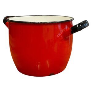 Add a pop of color and a touch of nostalgia to your kitchen with this stunning Vintage Huta Silesia Red Enameled Stockpot. This cook pot boasts a vibrant red enamel exterior contrasted by a sleek black rim, making it a standout piece for both functionality and style. The interior is coated in white enamel.
