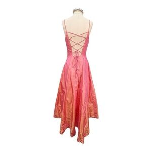 Features: 100% acetate fabric in a iridescent pink. Sleeveless. Square neckline. Lace up back detail. Maxi Length. Zip closure