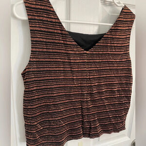 Sparkly vintage orange and black top. Square neckline in the front and V-neck in the back. Two front slits which is classically 90’s! Fully lined.