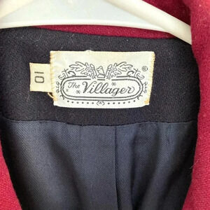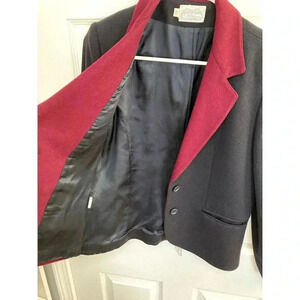 “International Ladies Garment, Workers Union” printed on the label. Stunning navy blue with red collar. Looks great with a pair of jeans and loose top underneath. Material tag is missing but the outside is a wool blend and the jacket is lined so it is not itchy.