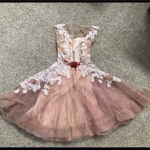 Absolutely stunning vintage Tulle and lace party dress. There is no size tag but I would say it's about a size 2/4. Has boning on the inner layer, and a beautiful velvet sash underneath the lace. Some parts of the lace have been ruined but could probably recover with new lace and make this a lovely restoration piece. Top is a sweetheart neckline covered in see through Tulle and lace to the collar bone and over the shoulders. Zipper may need some work as well. Overall a gorgeous vintage piece.