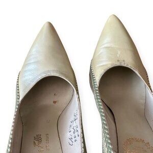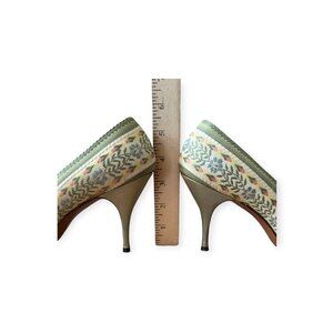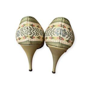 Vintage I. Miller pumps showcase a harmonious contrast between pale pistachio green pearlized leather and delicate floral tapestry, accentuated by elegant grosgrain trim.