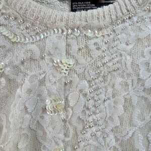 Ultra soft and feminine vintage sweater from IB Diffusion. This piece is embellished with lace, sequins, and faux pearl beads applied in a seemingly abstract & random pattern. Very unique & luxe. Please be sure to inspect the photos- this sweater has a few spots of light discoloration. It appears that it may have had shoulder pads at some point but they have been removed.