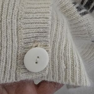 Vintage I.B. Diffusion cardigan with a unique luxury blend—58% silk, 10% angora (rabbit hair), 2% lambswool, and nylon for softness and stretch. Gorgeous cream and gray plaid design with a double-button front and cozy puff sleeves. Made in Hong Kong.