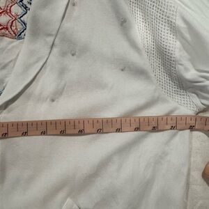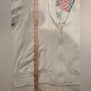 White jacket with vibrant fish embroidery and beading. Features orange, yellow, green, and blue colors.
