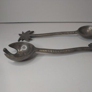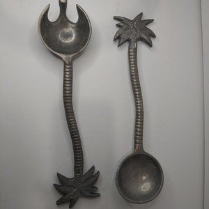 Vintage IHI India Cast Pewter Palm Tree Salad Serving Spoon & Fork Set 13"