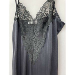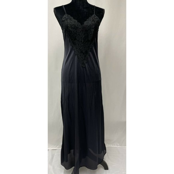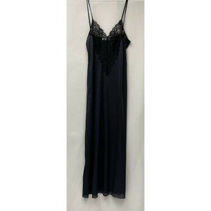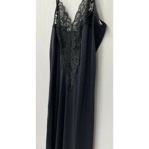 Vintage ILGWU Black Slip Lace Shiny Long Spaghetti Straps Nightie Medium.
