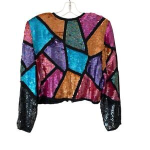 Vintage I.Magnin Colorful Multicolor Sequin Blazer Jacket size medium silk lined in excellent condition. Measurements laying flat chest 20 inches across and length 19 inches long