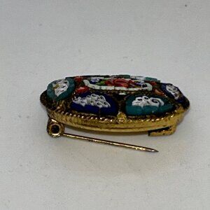 This unusual vintage micro mosaic brooch showcases intricate Italian craftsmanship with a vibrant floral design. Its gold-tone finish and secure c-clasp enhance its elegance.
