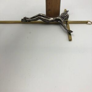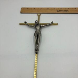 Vintage INRI Brass Jesus Crucifix Christian Religious Cross Hanging Wall Art Décor. Cross is vintage pre-owned. Please see all photos for visible condition. Approximately 10 inches x 5 inches. The cross appears to be brass but not sure about Jesus - he is a silvertone color - could be pewter but I'm not sure of what type of metal. Overall, in good condition - may have a minor scuff here or there on cross. Has a hanger to hang. Is lightweight but will be shipped up so it can be in a box for protection.
