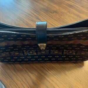 This elegant women's bag features a striking black and gold design, perfect for any occasion. Its sophisticated pattern adds a touch of luxury to your ensemble. From smoke free home. Gold accent is missing the turn portion but still closes.