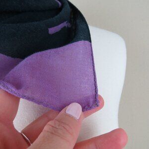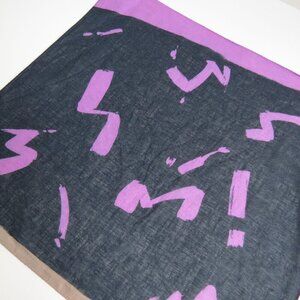 • black, purple & taupe screen printed cotton-linen scarf; graphic print; machine rolled hem