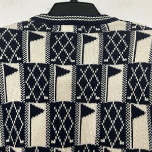 Classic vintage IZOD cardigan featuring a bold nautical flag geometric knit design in navy blue and cream.