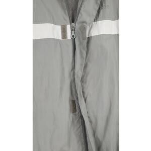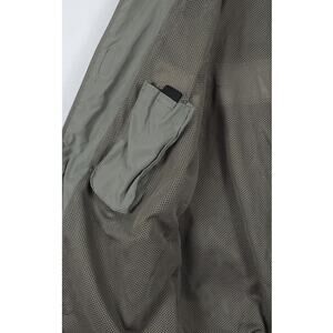 Velcro Fly Front conceals the Full Front Zipper. Front Slash Pockets. 2 Interior pockets, one for a Cell Phone. Mesh Lined. Elasticized Sleeves and Bottom. Greenish/Grey Poly, Men's Size Large. Our Inv# M 626
