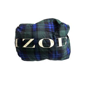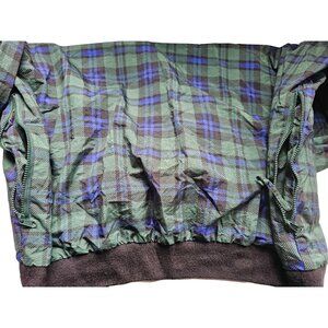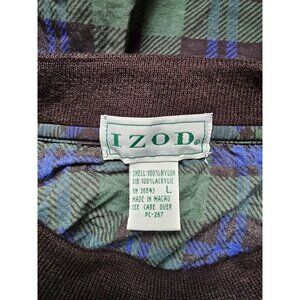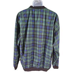 A vintage IZOD windbreaker pullover jacket in green, black, blue plaid. Features two zippered pockets and folds into its own pocket. Size large. Long-sleeved and made from durable nylon.