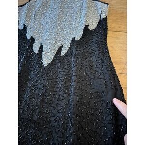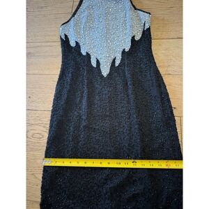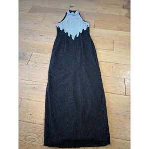 Stunning vintage gown, perfect for a formal event. This halter-style maxi dress features an elegant black fabric covered in intricate beadwork, creating a sophisticated texture and pattern. The design also includes a high beaded halter neckline with a distinctive silver beaded design adorning the upper bodice. The dress is fully lined.