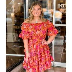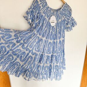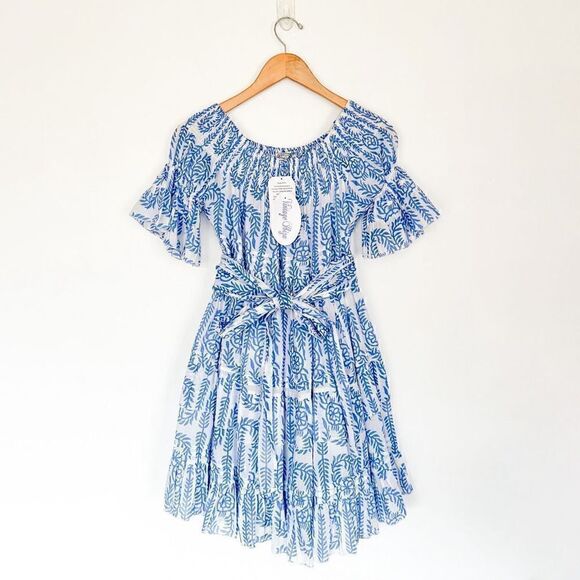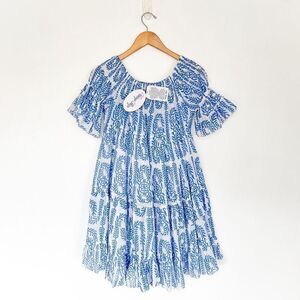 Vintage Ibiza Women’s Lightweight Cotton Blue and White Bobbin Off the Shoulder Smocked neckline boho romantic Mini Dress
