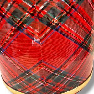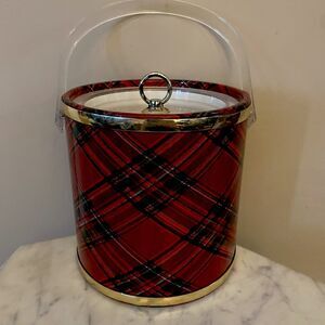 Vintage red tartan plaid ice bucket with clear lucite handle.
