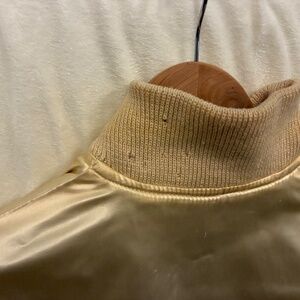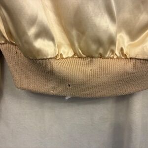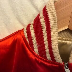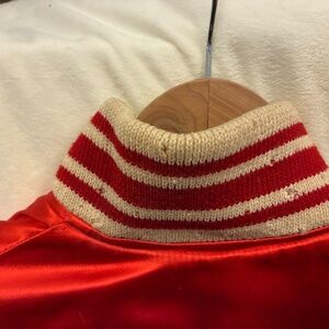This is a vintage Ice capades jacket perfect fun piece for the skater or fan! It is vintage, I believe from the 1980’s. I’ve tried to show the multiple small holes in the knit portions. There also some small stains throughout. The satin is scuffed and has small pulls. It was embroidered with a name that someone removed. Have a name embroidered and sewn on! The cream side has no embroidery. There is no sizing but appears to be a women’s small. Underarm to underarm is about 20”. Shoulder to waist is about 21”. Center back to shoulder about 9”. This is a unique piece but NOT in pristine condition, so please ask questions and view photos and know there are more marks. Do not return due to marks, stains, pulls. Zipper works. Slash pockets on red side.