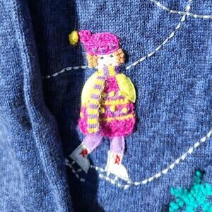 Cute vintage embroidered sweater with ice skaters and snowflake details. Soft blue knit with colorful stitching and a playful winter aesthetic.
