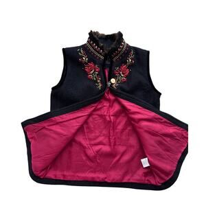 Vintage Icelandic Designs 100% wool vest featuring intricate floral embroidery, velvet-trimmed seams, and a faux-fur accented collar. Fully lined in magenta polyester for warmth and structure. Traditional toggle closure at the front. A statement piece that blends heritage craftsmanship with folklore and festival style. Ideal for layering over blouses, knits, or dresses. Perfect for fall holidays, winter gatherings, and cottagecore, fairycore, or witchy-inspired outfits. Laundering recommended upon receipt.