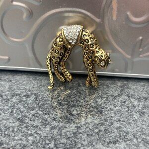 Elegant gold tone vintage leopard brooch adorned with Swarovski rhinestones. Perfect for adding a touch of glamour. Approx. 2 x 2 inches.