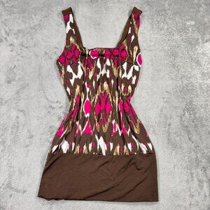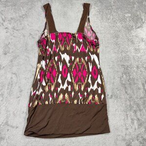 Vintage Ikat Print Y2K Tank Top Brown Pink Stretchy Sleeveless Preppy Shirt USA