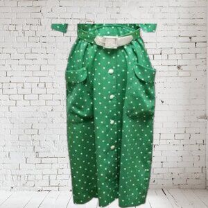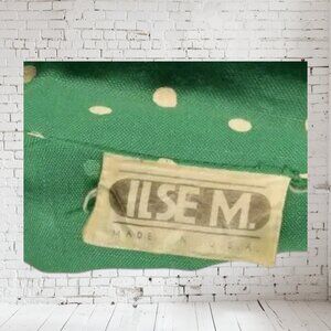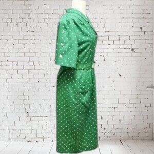 indicating it's a more recent piece, yet still vintage. The dress is a delightful green with white polka dots.