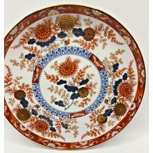 Beautiful Imari-style porcelain bowl/plate featuring vibrant oriental floral and chrysanthemum patterns in classic red, blue, and gold tones.
