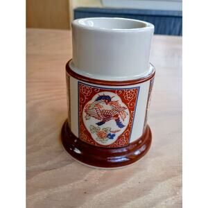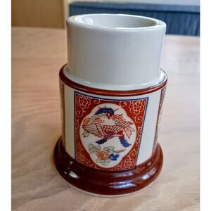 Charming Imari style design, created by artist Gailstyn-Sutton for Towle Co, made in Japan. Can be used for candles, florals, or trinkets. Created without handles, glazed in and out. Retains original label inside. The candle holder is cylindrical with a flared base and top. It is decorated with a detailed floral and bird design. This candle holder is a unique vintage piece that can add a touch of elegance to any home.