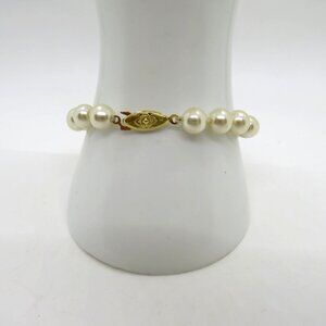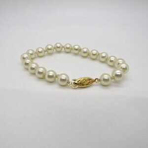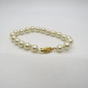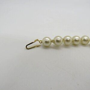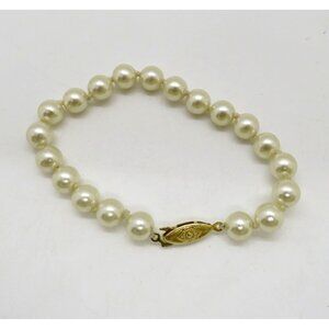 Vintage Imitation Pearl Bracelet 7.5" Knotted String Gold Tone Fish Hook Clasp - Preowned