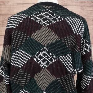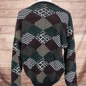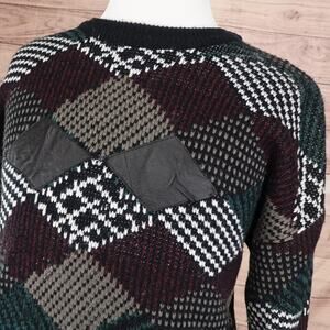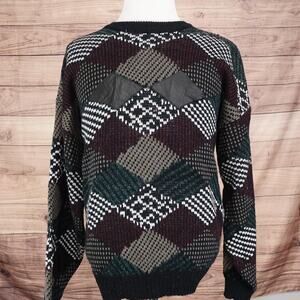 Vintage Impact Sweater Mens XL Green Burgundy Argyle Patch Accents Crewneck 90s