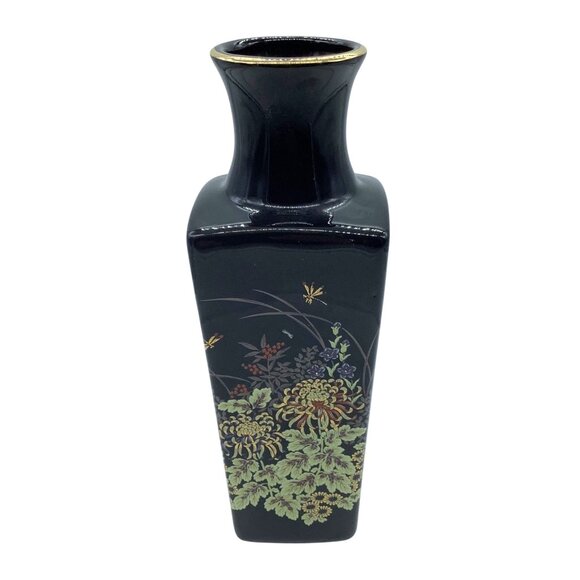 Vintage Imperial Dynasty by MANN Black Porcelain Vase Gold Trim Floral Design 7"
