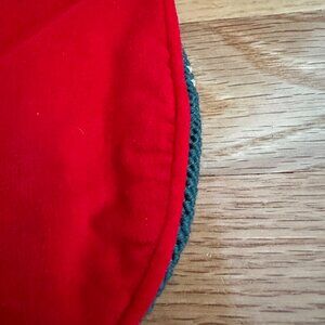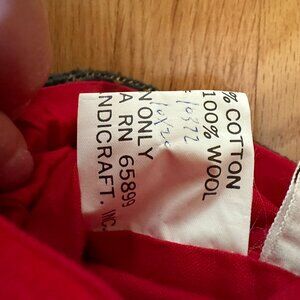 Vintage Imperial Elegance Wool Needlepoint Santa Clause Christmas Stocking. Green needlepoint background with a Santa Clause holding toys including a doll. Also a small Christmas tree. Red velvet back. Red velvet hanging hook. Imperial Elegance and fabric content tags on the interior. Needlepoint is 100% wool, red velvet backing is 100% cotton. Approximately 20", 6.5" wide at the top.