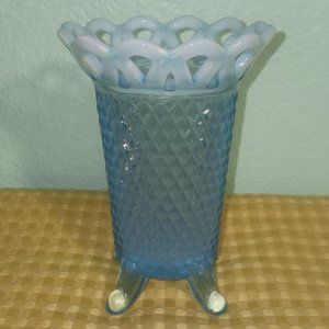 This is a vintage Imperial Glass Katy blue opalescent vase with a lace top that is the most unique shade of blue that I have see yet. In person, this piece is a stunning shade of lavender or periwinkle that is absolutely GORGEOUS!!! It features four glass feet and stands 5" tall and 3 1/2" across at its widest point and is in wonderful condition.