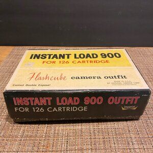 Step back in time with this classic Vintage Imperial Instant Load 900 126 Camera, a genuine relic from the era of tangible memories. This collectible camera comes with its original vibrant yellow and black box, boasting a charming retro design featuring a joyful baby - a classic marketing trademark of its time. Inside, you will find the sleek black camera with silver accents, ready to be admired or used by enthusiasts. The camera is specially designed for 126 film cartridges, perfect for creating that authentic vintage grain in your photos. Accompanying the camera are its original accessories: a handy set of instructions and two sealed flashcubes, ensuring you're all set to capture those spontaneous moments with a pop of flash. Whether for the discerning collector or the experimental photographer, this complete outfit preserves the magic of analog photography.