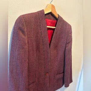 Vintage Import Image Blazer. 100% wool, fully lined. Micro black, tan and fucshia knit pattern that gives a cool red appearance. Single button closure. Pockets. Truly stunning!