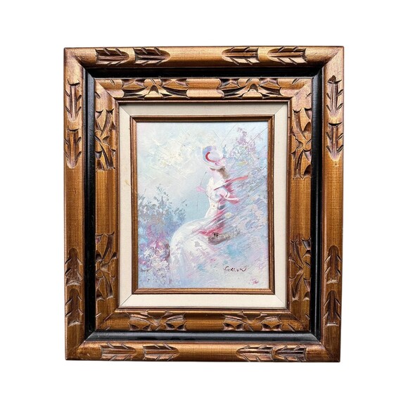 Bring soft romantic charm to your space with this vintage impressionist lady portrait painting, beautifully presented in a hand-carved wooden frame. This is a painting (not a print), executed in dreamy pastel tones with expressive, textured brushstrokes. It is signed in the lower corner, though the artist may be unknown. It’s a painted reproduction of another artist.