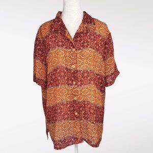 Bold and breezy floral shirt from Impressions of California with a richly patterned print. Lightweight with a soft drape and classic relaxed cut. Made in USA, early ‘90s era. • Short sleeve, button front • Loose fit, split hem • Fabric is lightweight, semi-sheer • Made in USA • Colors include brick red, orange, blue • 100% Polyester excellent vintage condition, no flaws no holes, no tears, no stains SIZE LARGE measurements – laid flat sleeve: 9.2" shoulders: 17" bust: (pit to pit) 22.3" length (shoulder to hem): 27" bottom hem (laid flat + across): 22.5"