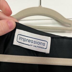 Elegant vintage black satin-look tank top from Impressions of California, featuring a beautiful V-neckline adorned with tonal floral lace embroidery. Perfect for layering or wearing solo for a classic minimalist look.